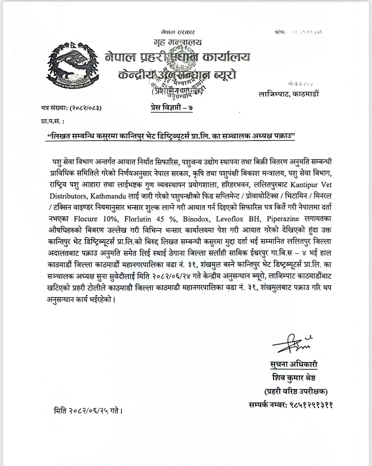 लिखत सम्बन्धि कसुरमा कान्तिपुर भेट डिष्ट्रिब्यूटर्स प्रा.लि. का सञ्चालक अध्यक्ष पक्राउ (2082-06-25) २०८२-०६-२५ A A- A+ Share